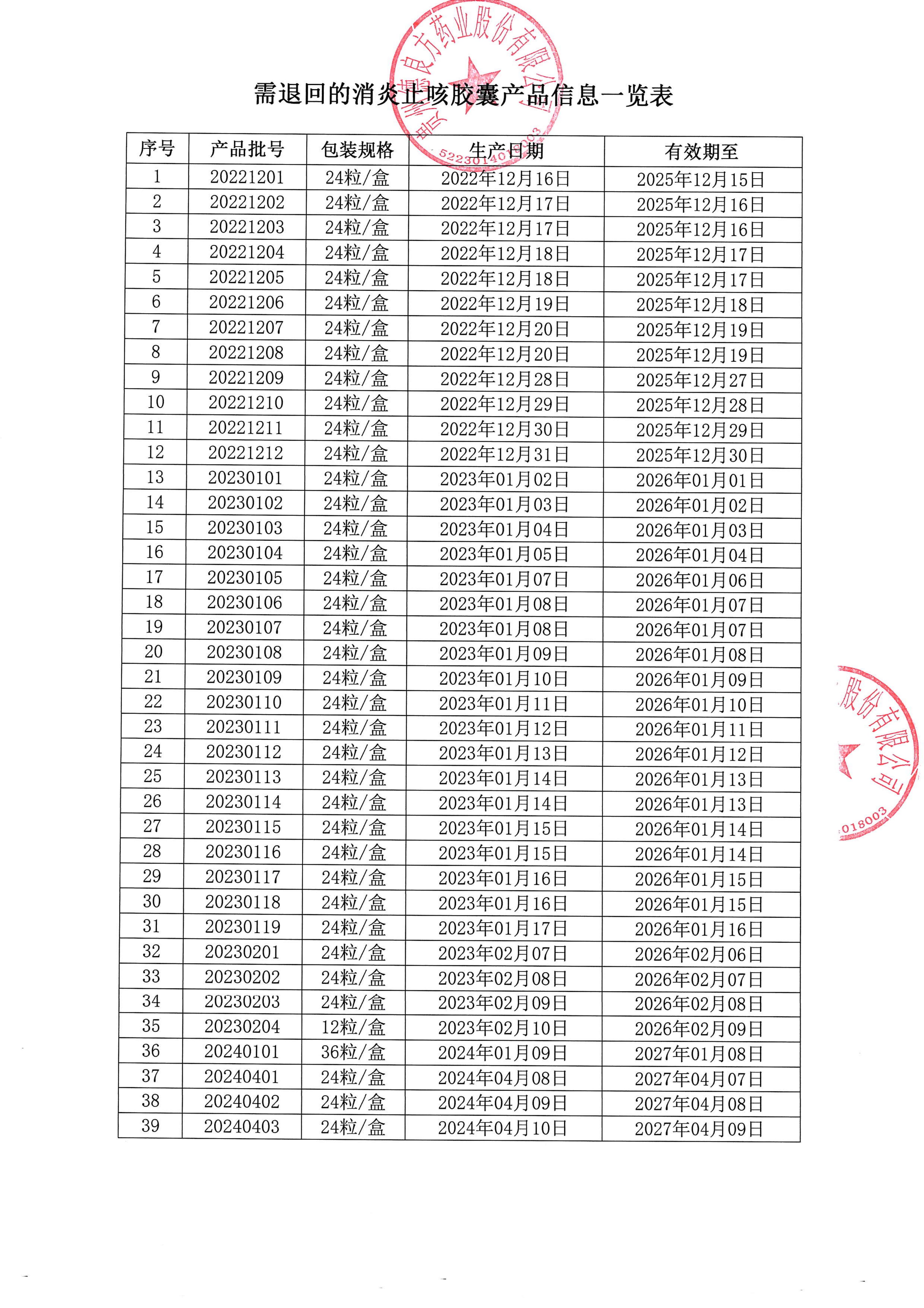 附表:需退回消炎止咳膠囊的產(chǎn)品信息一覽表