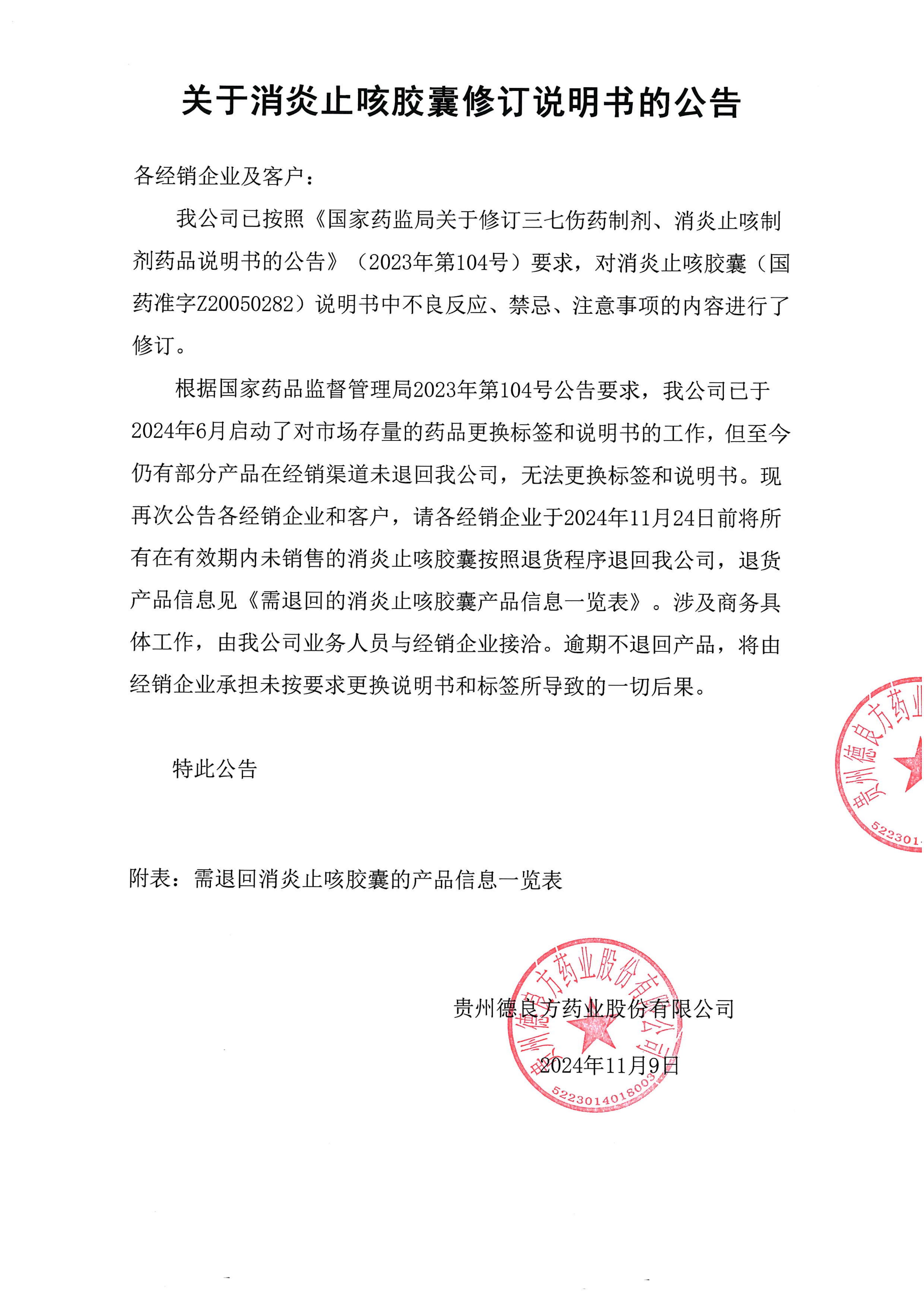 根據(jù)國(guó)家藥品監(jiān)督管理局2023年第104號(hào)公告要求,我公司己于2024年6月啟動(dòng)了對(duì)市場(chǎng)存量的藥品更換標(biāo)簽和說(shuō)明書(shū)的工作,但至今仍有部分產(chǎn)品在經(jīng)銷(xiāo)渠道未退回我公司,無(wú)法更換標(biāo)簽和所明書(shū)?,F(xiàn)再次公告各經(jīng)銷(xiāo)企業(yè)和客戶請(qǐng)各經(jīng)銷(xiāo)企業(yè)于2024絲年11月24日前將所有在有效期內(nèi)未銷(xiāo)售的止咳膠囊按照退貨程序退回我公司,退貨產(chǎn)品信息見(jiàn) 《需退回的消炎止咳膠囊產(chǎn)品信息一覽表》。涉及商務(wù)具體工作,由我公司業(yè)務(wù)人員與經(jīng)銷(xiāo)企業(yè)接洽。逾期不退回產(chǎn)品,將由經(jīng)銷(xiāo)企業(yè)承擔(dān)未按要求更換說(shuō)明書(shū)和標(biāo)簽所導(dǎo)致的一切后果。
